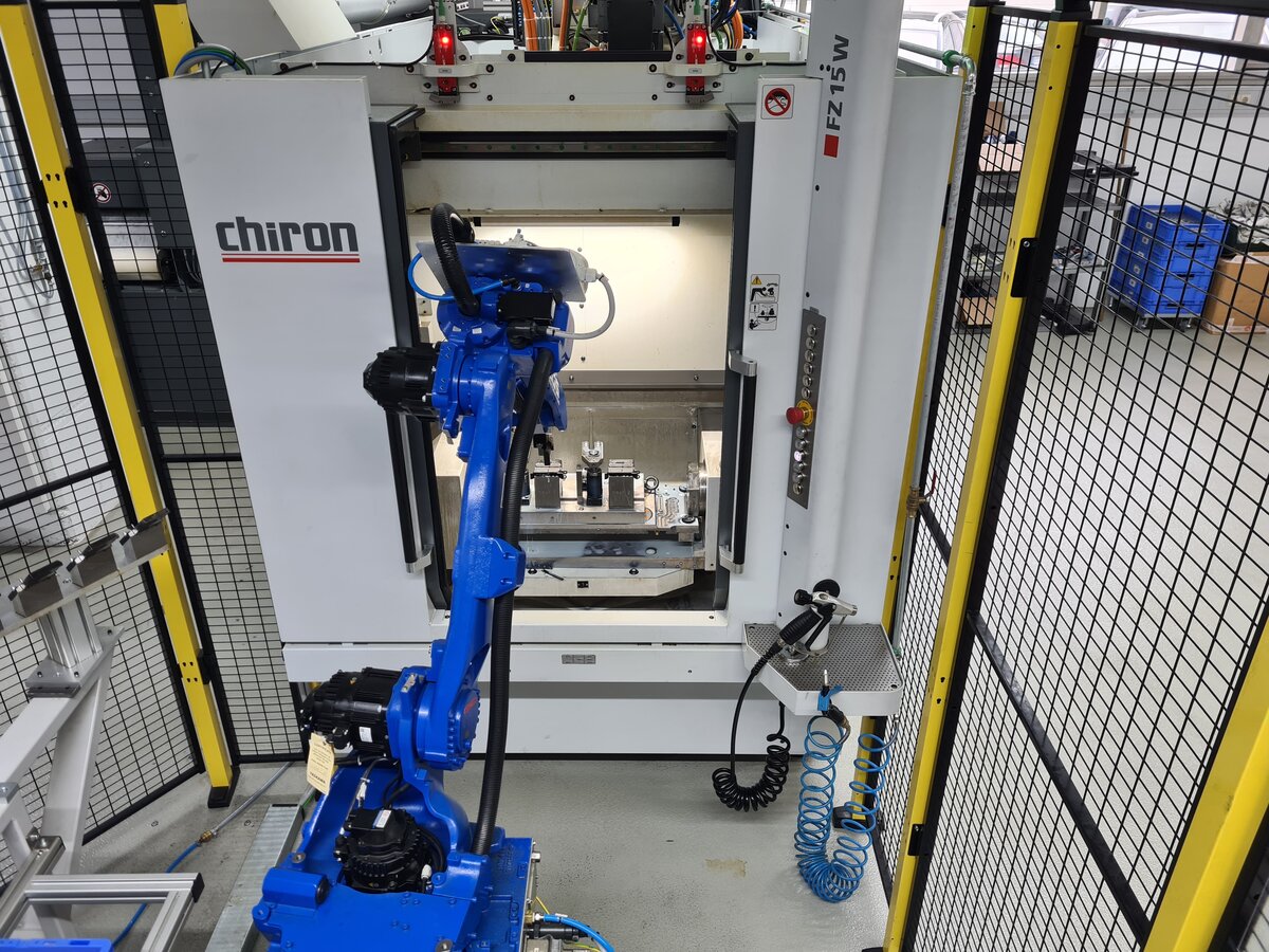 The first robotic cell at Ernst Reiner was connected to an existing Chiron FZ15W CNC machining center, which had previously been loaded manually. The machine’s rotary table is loaded and unloaded on one side, while workpieces are machined on the other. The space-saving layout of the EGS cell was immediately convincing—a key factor given limited production space. EGS positioned the robot so that manual loading remains possible, for example, for small batches or during setup. Retrofitting the existing machine for automation—such as converting manual clamping devices to automatic clamping technology—turned out to be more complex than initially expected.