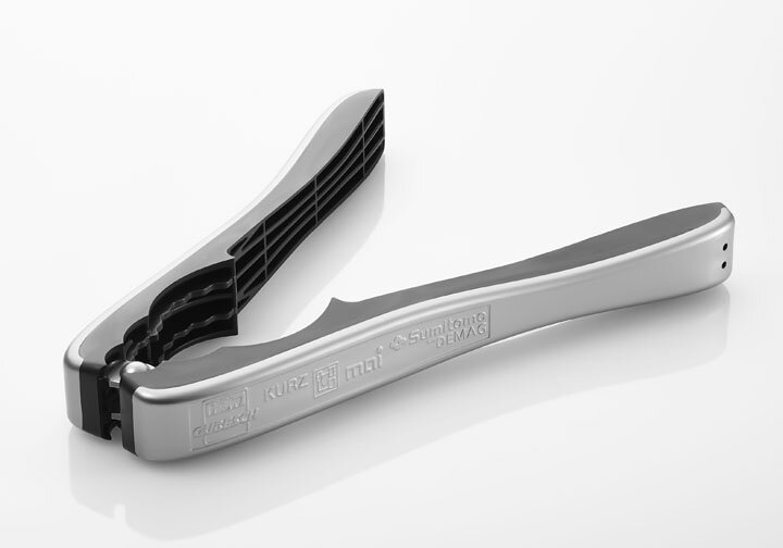 The manufacturing cell consisted of a Sumitomo (SHI) Demag Systec Servo 210 injection molding machine, a 6-axis MH12 robot from Yaskawa with a multiple gripper system and hot-handling for the UD tapes, as well as unloading stations for the graphic overlays and the metal inlays. Also integrated into the cell were a heating and unloading station for the UD tapes, a cutting station for sprue removal and a riveting station for joining the two halves of the nutcracker.