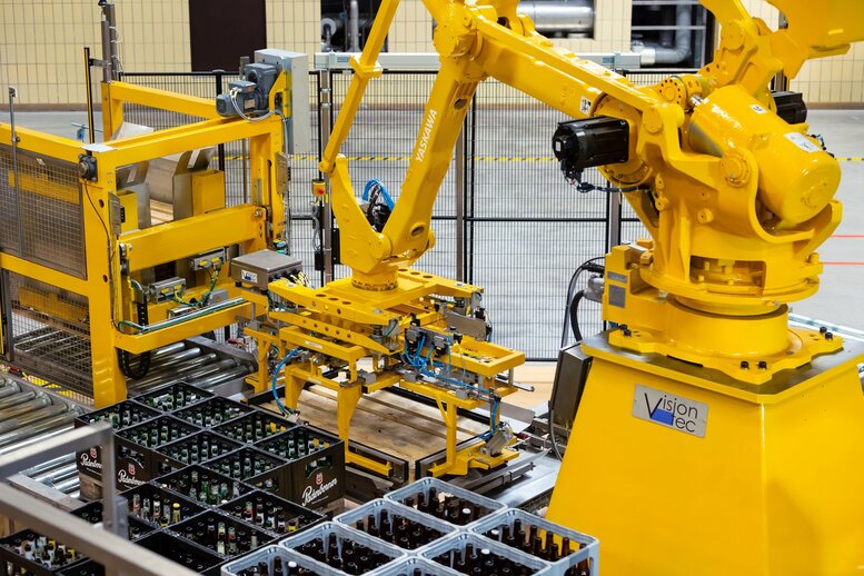 The Paderborner brewery is continuing automation of its bottling line with a complete sorting and repacking system for third-party empties implemented by vision-tec. The innovative use of a Motoman jointed-arm robot is the centrepiece of this solution.